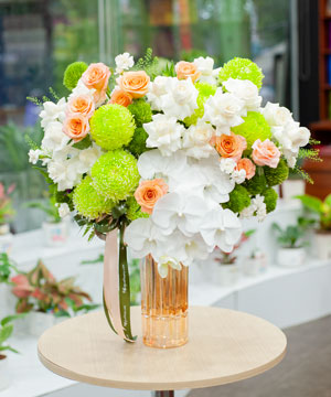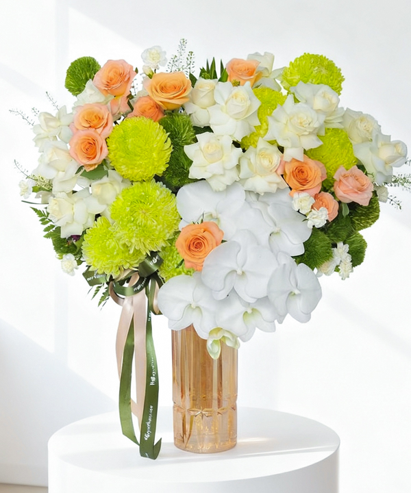 Sự kết hợp giữa hồng trắng thanh khiết, shimmer cam ấm áp, lan hồ điệp trắng sang trọng và green wicky xanh tạo nên một bố cục hài hòa, tươi mới nhưng không kém phần tinh tế. Màu trắng đại diện cho sự thuần khiết và trang nhã, cam mang đến cảm giác ấm cúng, cởi mở, còn sắc xanh gợi sự gần gũi với thiên nhiên, tràn đầy năng lượng tích cực.
