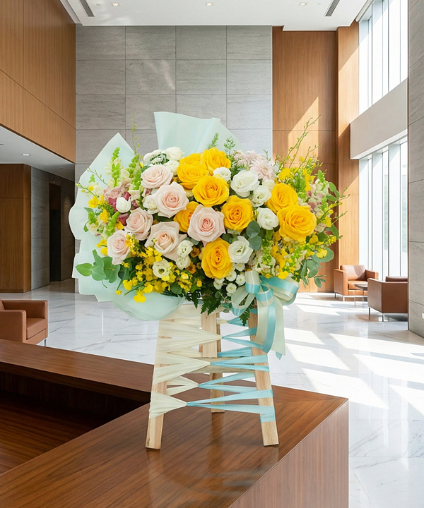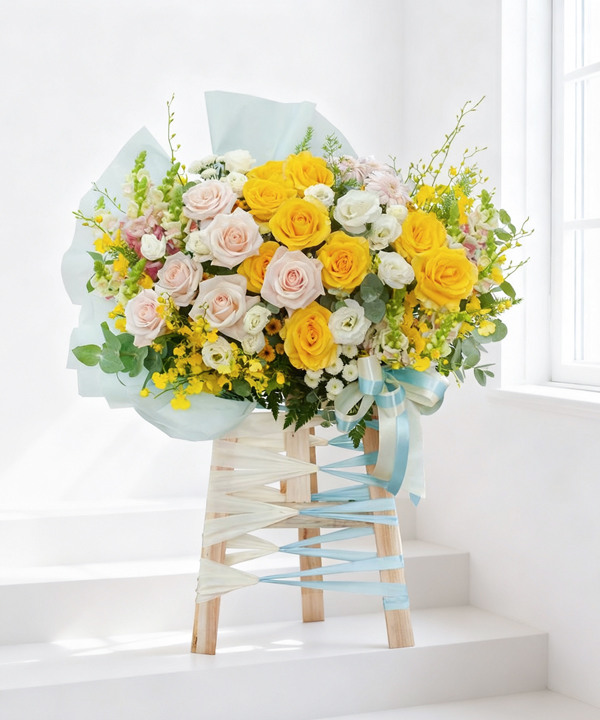 Kệ hoa này là sự kết hợp hài hòa giữa hoa hồng vàng tươi sáng, hoa hồng ohara màu pastel nhẹ nhàngtạo nên một cảm giác tràn đầy sức sống và tinh tế. Thông điệp của kệ hoa muốn gửi gắm: “Xin gửi đến bạn những sắc màu rực rỡ của tình yêu và sự lạc quan. Mỗi bông hoa không chỉ mang vẻ đẹp riêng mà còn là biểu tượng của niềm hạnh phúc và thành công mà chúng tôi chúc bạn sẽ đạt được.”