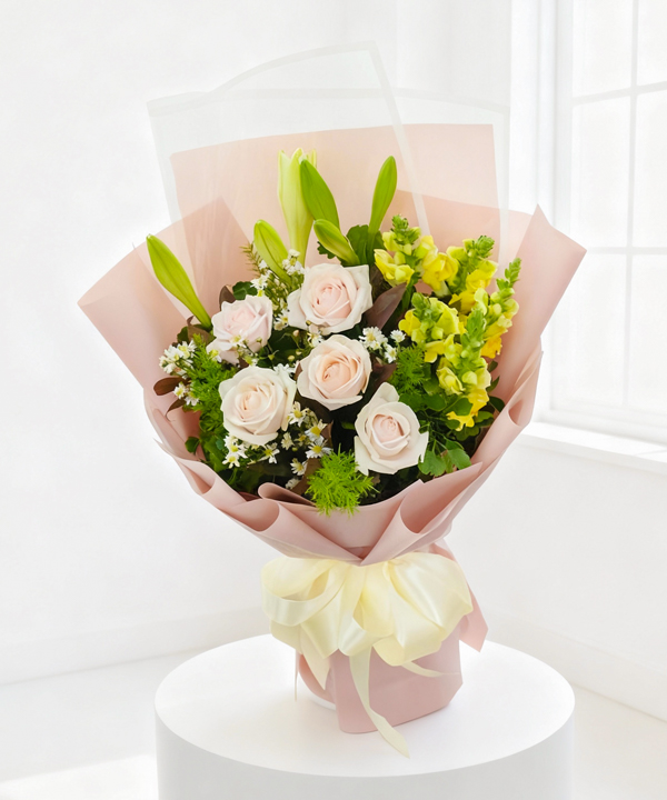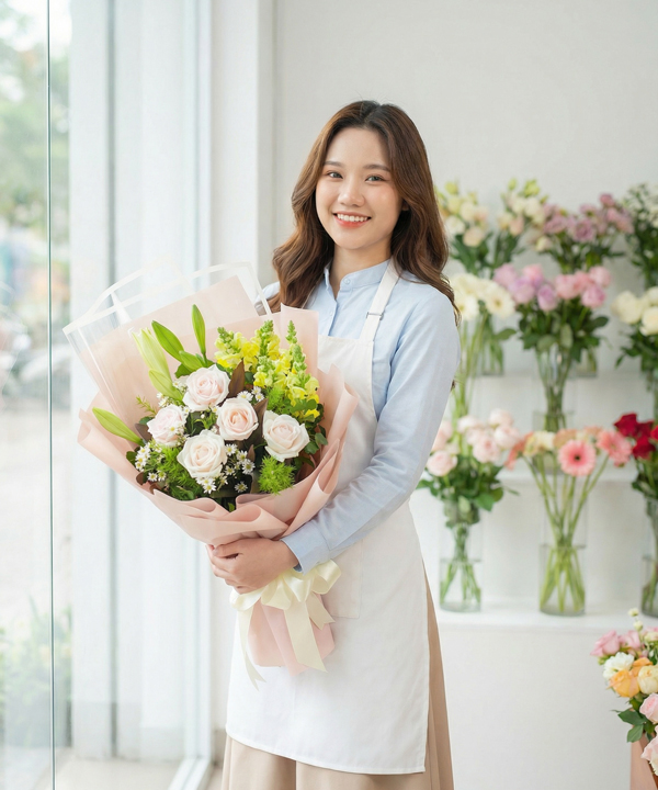 *Ghi chú: Sản phẩm sử dụng hoa theo mùa, trường hợp hết hoa như mẫu Shop sẽ linh động thay thế sang các loại hoa khác cùng tông màu và cam kết đảm bảo giá trị thẩm mỹ của sản phẩm.