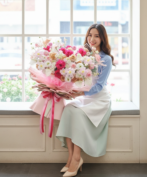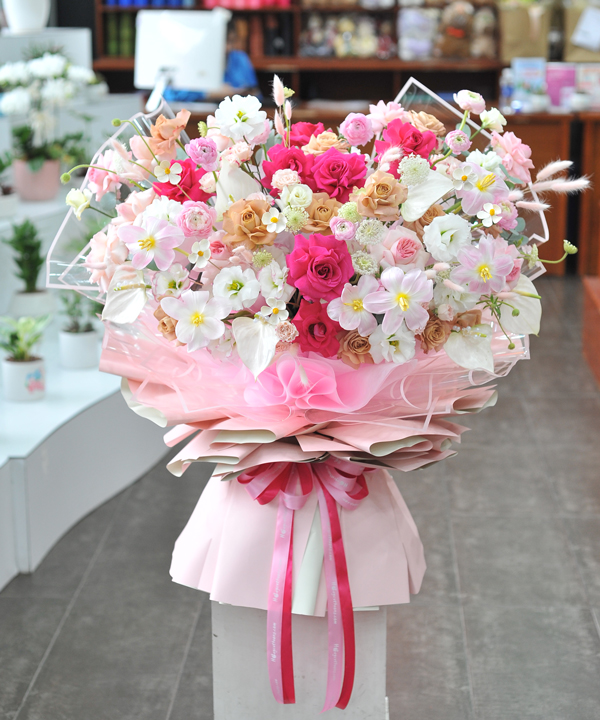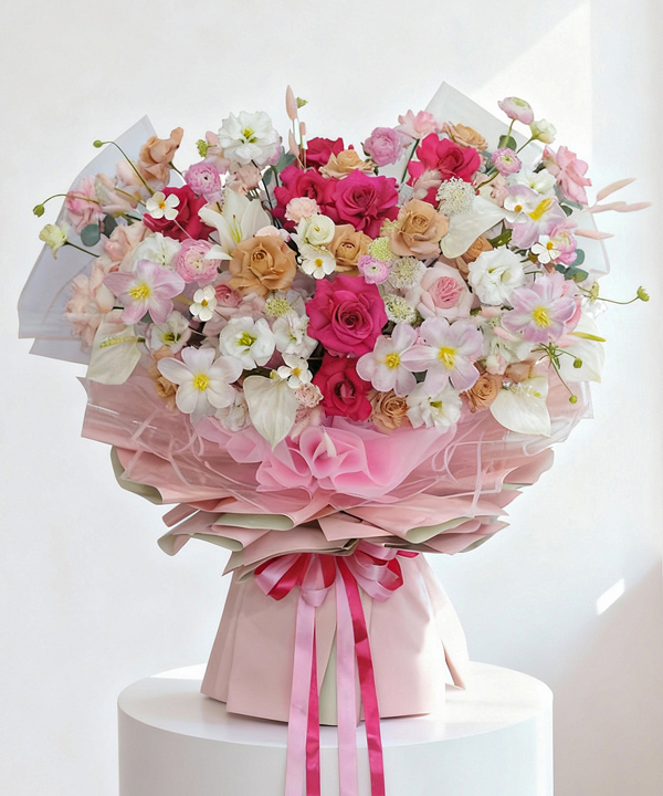 Bó hoa là sự kết hợp tinh tế giữa hồng Pink Floyd rực rỡ, hồng lạc thần kiêu sa và hồng capuchino trầm ấm, xen kẽ cùng những bông tulip thanh lịch, mao lương bồng bềnh, thuý châu trắng nhập khẩu và cát tường mềm mại. Sắc độ chuyển từ hồng đậm sang hồng nude và trắng kem tạo nên cảm giác vừa sang trọng, vừa ngọt ngào, như câu chuyện tình yêu trưởng thành nhưng vẫn đầy rung động. Hồng Pink Floyd biểu trưng cho tình cảm nồng nhiệt, lạc thần là sự trân trọng, capuchino mang nét chín chắn, tinh tế; tulip và mao lương gửi gắm niềm hy vọng vào tương lai tươi sáng, trong khi thuý châu trắng và cát tường là lời chúc bình an, may mắn. Tổng thể bó hoa như một lời tỏ bày dịu dàng nhưng đầy khí chất: chúng ta hãy luôn trân trọng nhau, và hãy cùng bước tiếp những chặng đường phía trước trong yêu thương.