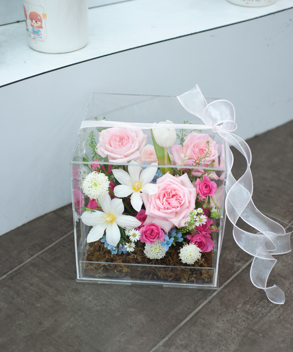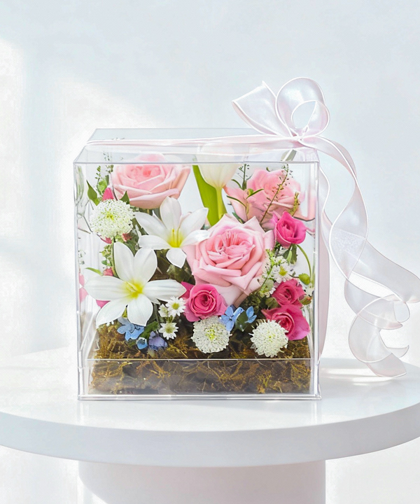 Hộp hoa mica trong suốt được thiết kế như một khu vườn dịu sáng, nơi vẻ đẹp kiêu kỳ của hoa hồng Pink O’Hara hòa quyện cùng tulip trắng thanh khiết, sao xanh mơ màng và thúy châu trắng tinh khôi. Sự kết hợp tinh tế này mang đến cảm giác nhẹ nhàng, lãng mạn và trong trẻo như ánh bình minh đầu ngày.