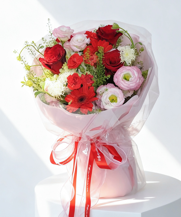 Bó hoa là sự kết hợp giữa hồng đỏ, cát tường hồng, đồng tiền đỏ và hoa thủy châu trắng, mang lại vẻ đẹp tươi tắn và ấm áp. Sắc đỏ tượng trưng cho tình yêu nồng nàn và may mắn, trong khi sắc hồng thể hiện sự dịu dàng, yêu thương. Đây là bó hoa lý tưởng cho dịp sinh nhật, kỷ niệm hoặc chúc mừng khai trương.