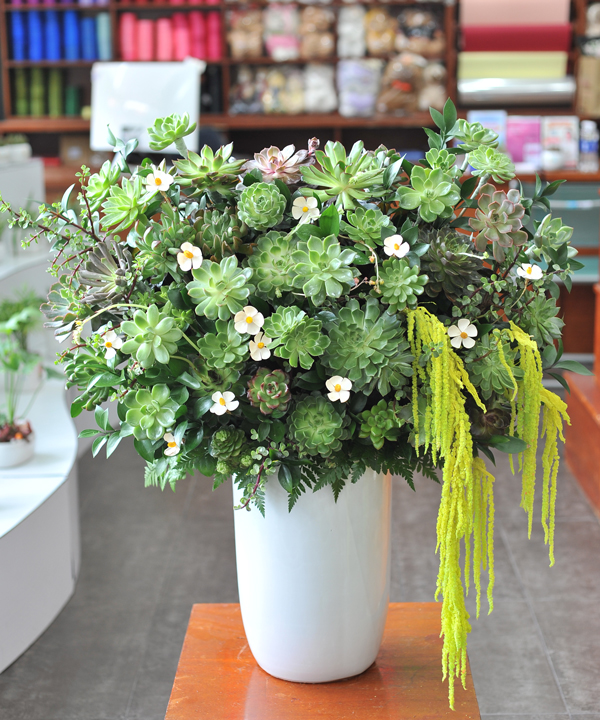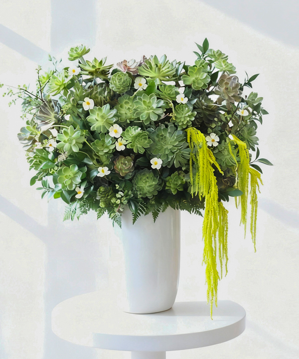 Bình hoa sen đá là lời nhắn nhủ dịu dàng về sức sống bền bỉ và niềm tin vào hành trình của chính mình. Những đóa sen đá xanh mướt tựa những bông hoa kiên cường, có thể sống lâu và vẫn vươn mình đẹp đẽ dù qua bao nắng gió. Điểm nhấn là những cành dền rũ mềm mại buông xuống, tạo cảm giác dòng chảy thời gian nhẹ nhàng, nhắc ta rằng mọi khó khăn rồi cũng sẽ trôi qua. Giữa sắc xanh an yên ấy, ta học cách chậm lại, hít một hơi thật sâu và mỉm cười trước những thử thách. Bình hoa gửi gắm thông điệp: chỉ cần kiên trì và giữ niềm lạc quan, cuộc đời sẽ luôn dành tặng ta những mùa “hoa nở” thật xứng đáng.